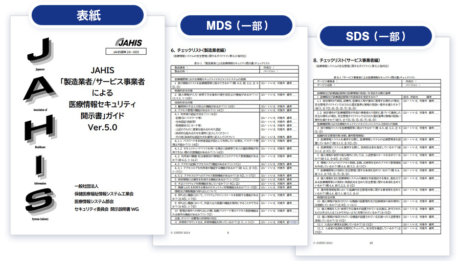 「製造業者/サービス事業者による医療情報セキュリティ開示書(MDS/SDS)」とは、各製造業者/サービス事業者の医療情報システムのセキュリティ機能に関する説明の標準的記載方法(書式)を、一般社団法人保健医療福祉情報システム工業会(JAHIS)および一般社団法人日本画像医療システム工業(JIRA)で定めた文書です。本文書の項目は「3省2ガイドライン」に含まれる「医療情報システムの安全管理に関するガイドライン」に基づいた内容となっているため、医療機関等で使用している情報機器・システム・サービスの「医療情報システムの安全管理に関するガイドライン」に対する準拠性を確認することができます。各システムベンダーは、文書内の「MDS/SDSチェックリスト」を用いて、医療情報システム・サービス等のセキュリティ対応状況を医療機関等に開示することが求められています。