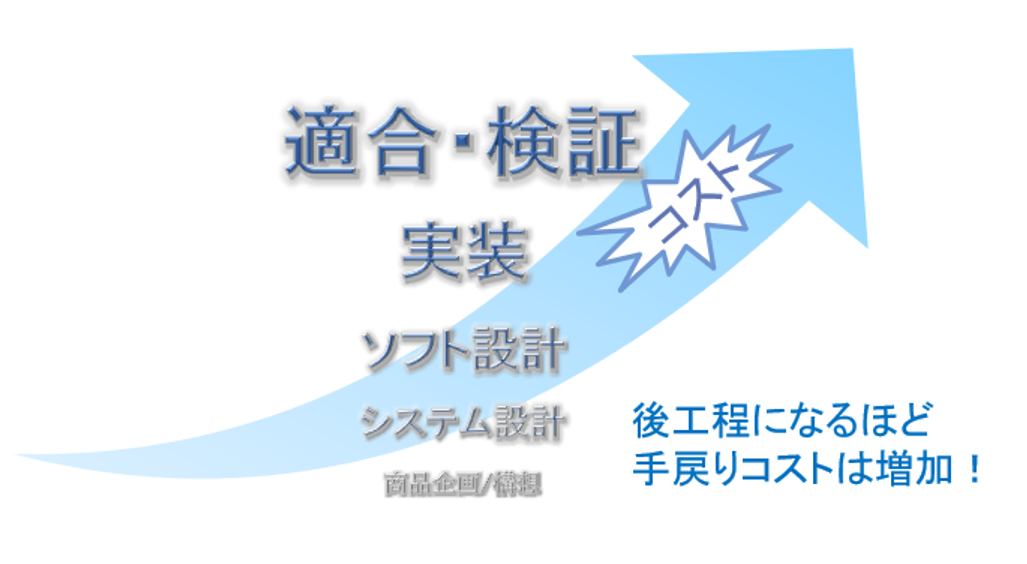 特にメカやエレキを含むシステム開発においては、不具合が発生した際の手戻りコストは増大します。