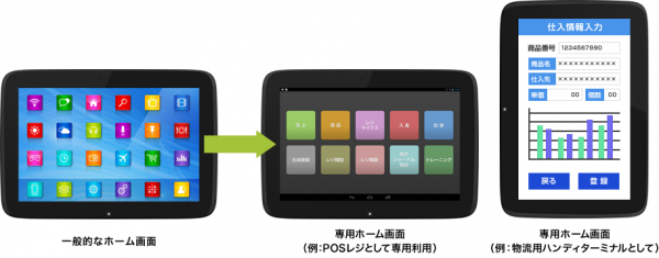専用のホーム画面に変更し、使用できるアプリケーションだけが表示される構成にします。 ホーム画面を利用用途に最適化した構成にする事で、使いたいアプリケーションを簡単に見つけられるようになります。 また、間違ったアプリを起動する心配も無くなります。