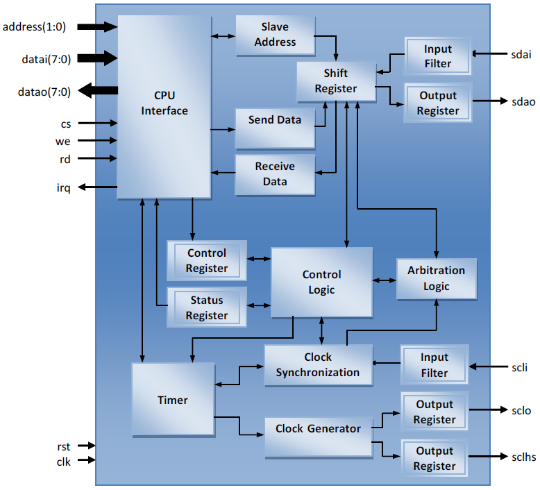 I2Cは、2線式の双方向シリアルバスであり、デバイス間のデータ伝送のシンプルで効率的な方法を提供します。I2Cインターフェース マスターは、マイクロプロセッサ/マイクロコントローラとI2Cバス間のインタフェースを提供します。マイクロプロセッサ/マイクロコントローラによって決定される動作モードに応じて、マスタとして動作します。DI2CMコアには I2C仕様 v.3.0のすべての機能が組み込まれています。